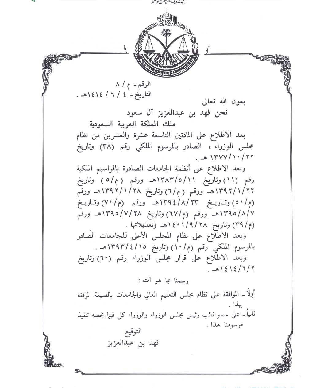 مرسوم ملكي رقم م/8 بتاريخ 4 / 6 / 1414